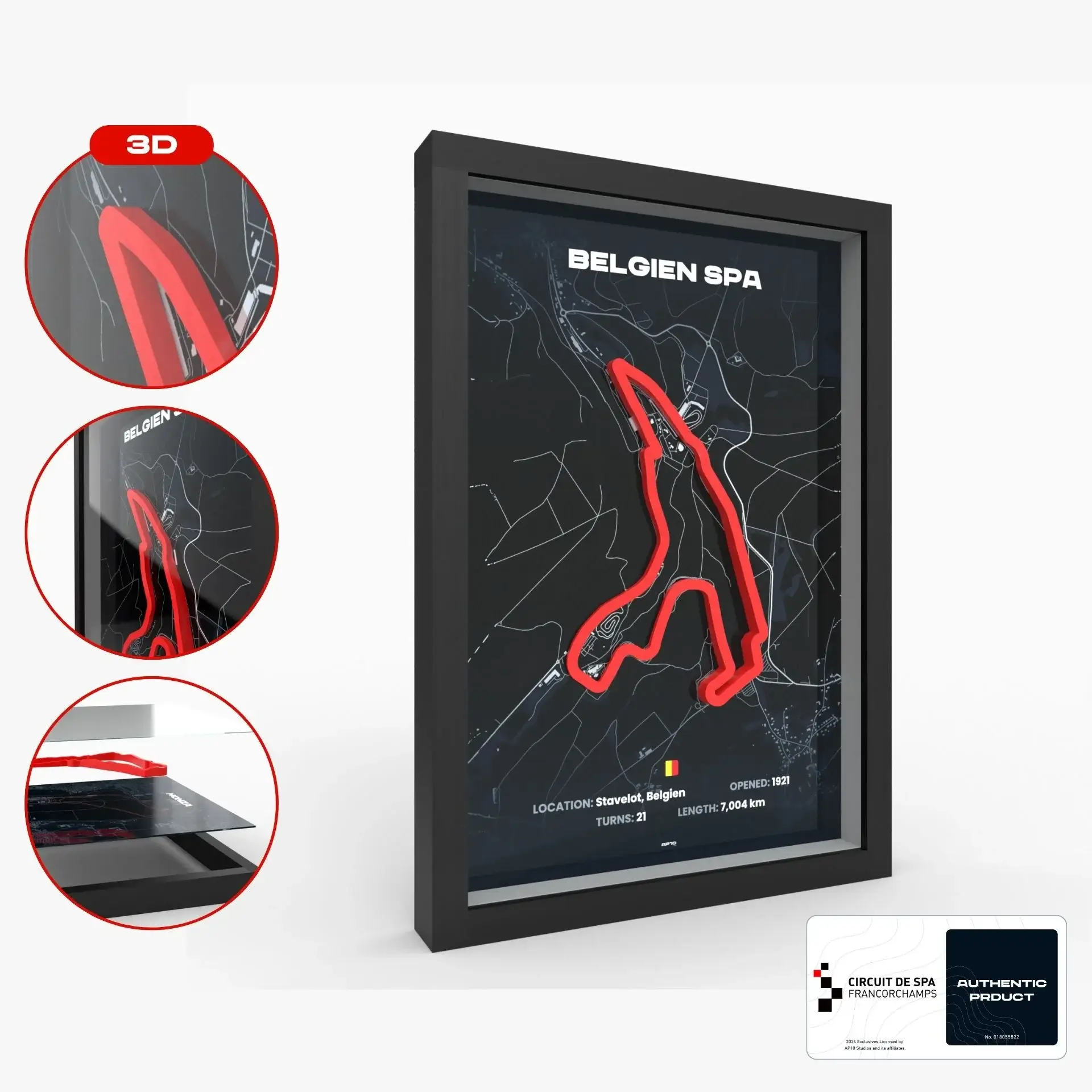 Unser 3D-Poster des Spa-Francorchamps Grand Prix zeichnet sich durch beeindruckende Detailtreue und hochwertige Verarbeitung aus. Die präzise 3D-gedruckte Strecke des Circuit de Spa-Francorchamps zeigt jede Kurve, jede Gerade und die einzigartigen Merkmale der Rennstrecke mit höchster Genauigkeit. Der Premium-Druck des Hintergrundposters in 300 DPI-Auflösung gewährleistet gestochen scharfe Bilder und lebhafte Farben, die die Atmosphäre des Spa-Francorchamps Grand Prix perfekt einfangen.